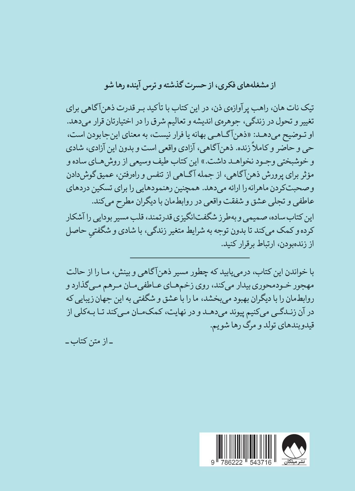 تیک نات هان، راهب پرآوازه‌ی ذن، در این کتاب با تأکید بـر قدرت ذهن‌آگاهی برای تغییر و تحول در زندگی، جوهره‌ی اندیشه و تعالیم شرق را در اختیارتان قرار می‌دهد. او تـوضیح می‌دهـد: «ذهن‌آگـاهـی بهانه یا فرار نیست، بـه معنای اینجابـودن است، حی و حاضر و کاملاً زنده. ذهن‌آگاهی، آزادی واقعی است و بدون این آزادی، شادی و خوشبختی وجـود نخواهـد داشت.» این کتاب طیف وسیعی از روش‌هـای ساده و مؤثر برای پرورش ذهن‌آگاهی، از جمله آگـاهی از تنفس و راه‌رفتن، عمیق گوش‌دادن و صحبت‌کردن ماهرانه را ارائه می‌دهد. همچنین رهنمودهایی را برای تسکین دردهای عاطفی و تجلی عشق و شفقت واقعی در روابط‌مان با دیگران مطرح می‌کند.