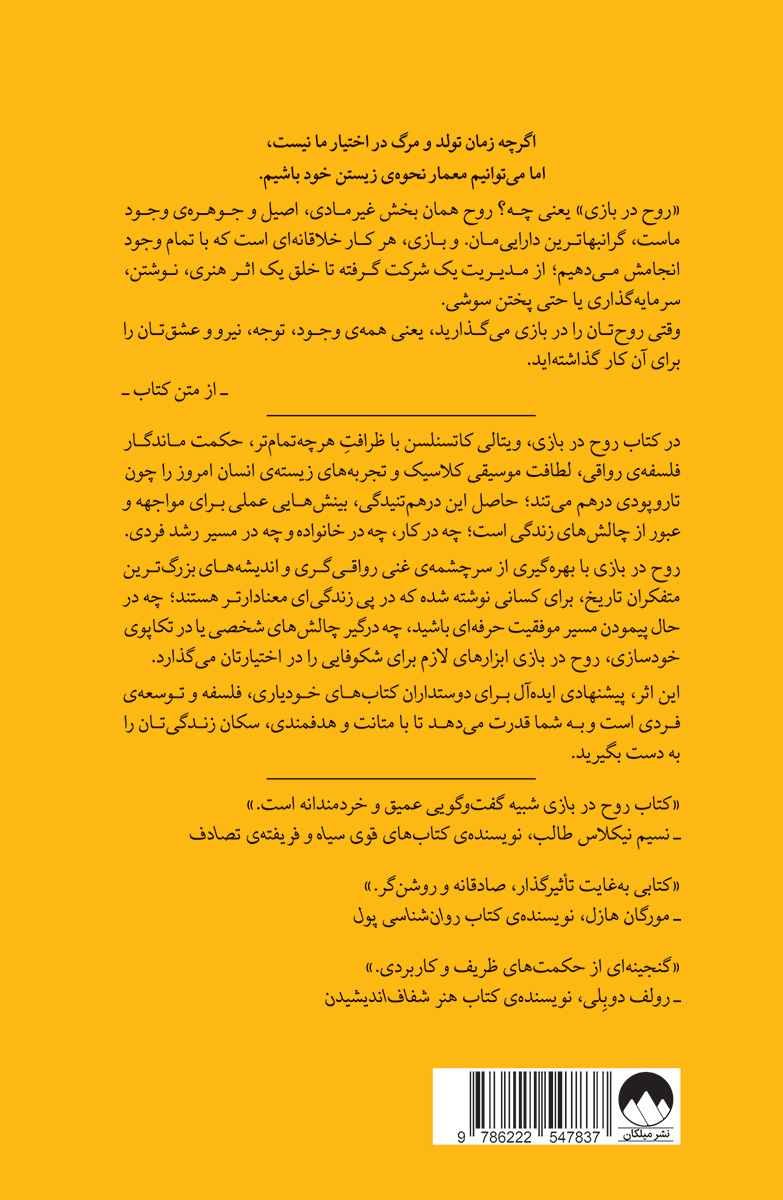اگرچه زمان تولد و مرگ در اختیار ما نیست، اما می‌توانیم معمار نحوه‌ی زیستن خود باشیم.«روح در بازی» یعنی چـه؟ روح همان بخش غیرمـادی، اصیل و جـوهـره‌ی وجـود ماست، گرانبهاتـرین دارایی‌مـان. و بـازی، هر کـار خلاقانه‌ای است که با تمام وجود انجامش مـی‌دهیم؛ از مـدیـریت یک شرکت گـرفته تا خلق یک اثـر هنری، نـوشتن، سرمایه‌گذاری یا حتی پختن سوشی. وقتی روح‌تـان را در بازی می‌گـذارید، یعنی همه‌ی وجـود، توجه، نیرو و عشق‌تـان را برای آن کار گذاشته‌اید.ـ از متن کتاب ـ