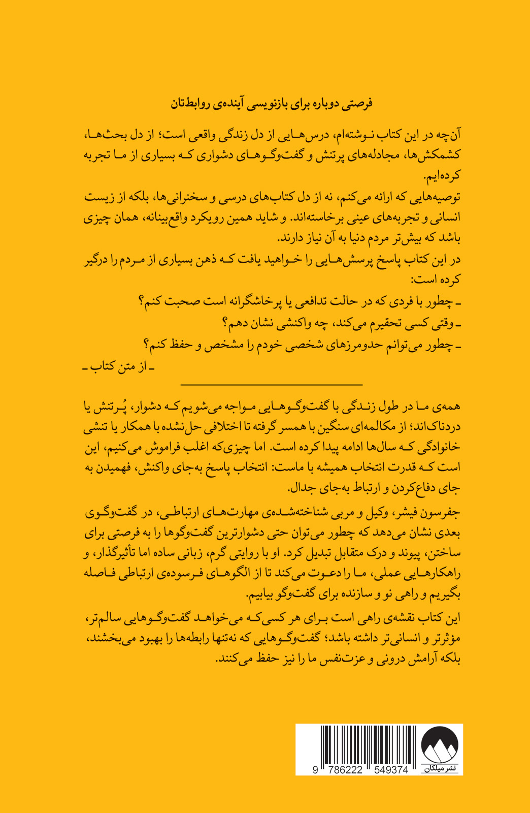 این کتاب نقشه‌ی راهی است بـرای هر کسی‌کـه می‌خواهـد گفت‌وگـوهایی سالم‌تر، مؤثرتر و انسانی‌تر داشته باشد؛ گفت‌وگـوهایی که نه‌تنها رابطه‌ها را بهبود می‌بخشند، بلکه آرامش درونی و عزت‌نفس ما را نیز حفظ می‌کنند.