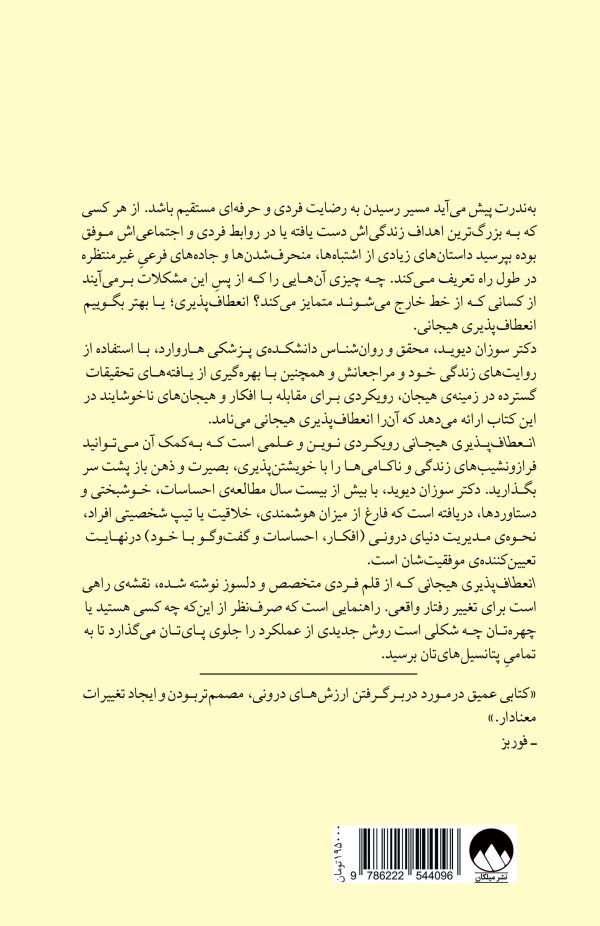 انعطافپذیری هیجانی رویکردی نوین و علمی است که بهکمک آن میتوانید فرازونشیبهای زندگی و ناکامیها را با خویشتنپذیری، بصیرت و ذهن باز پشت سر بگذارید. دکتر سوزان دیوید، با بیش از بیست سال مطالعهی احساسات، خوشبختی و دستاوردها، دریافته است که فارغ از میزان هوشمندی، خلاقیت یا تیپ شخصیتی افراد، نحوهی مدیریت دنیای درونی (افکار، احساسات و گفتوگو با خود) درنهایت تعیینکنندهی موفقیتشان است.