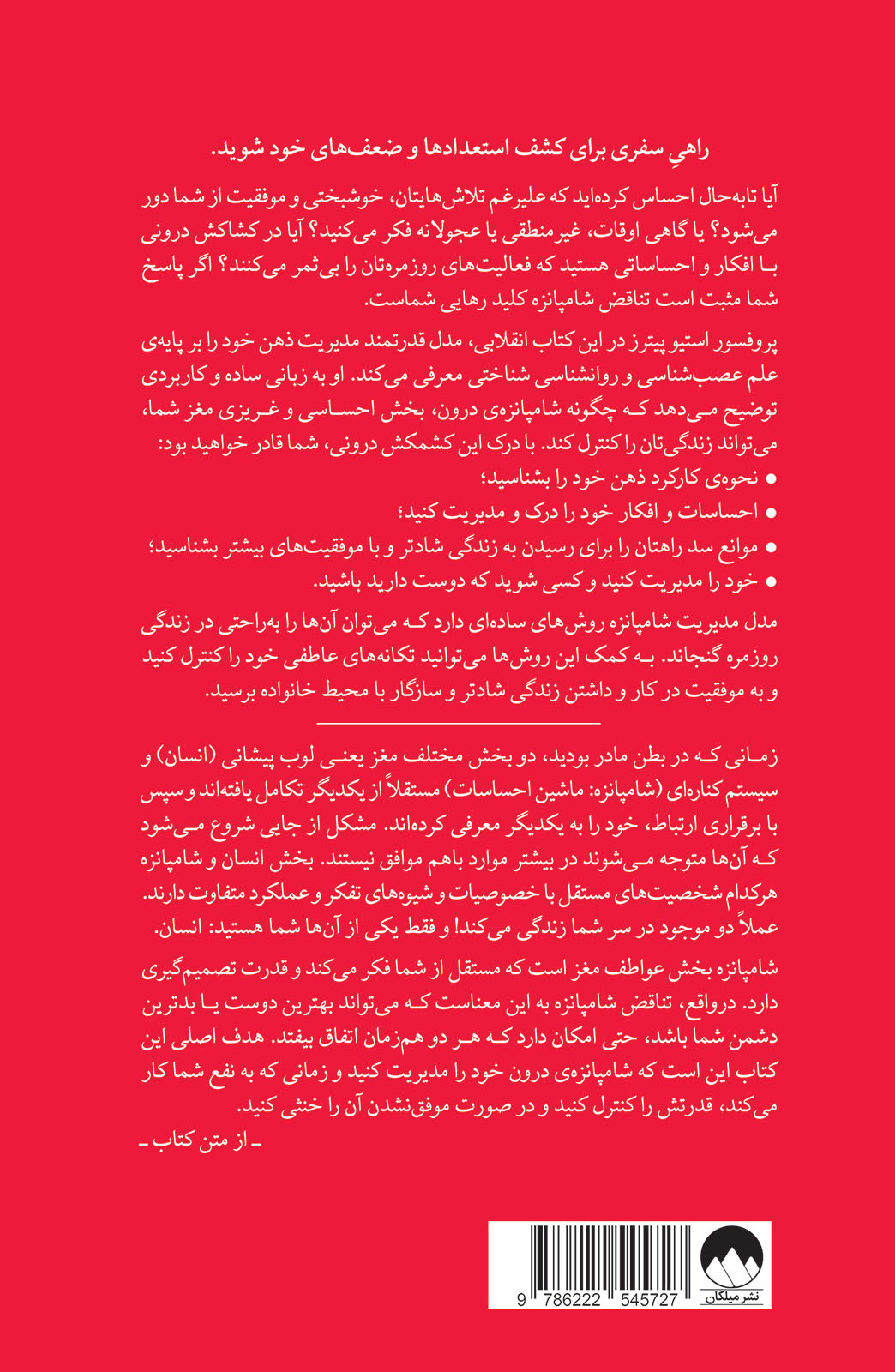 زمـانی کـه در بطن مادر بودید، دو بخش مختلف مغز یعنـی لوب پیشانی (انسان) و سیستم کنارهای (شامپانزه: ماشین احساسات) مستقلاً از یکدیگر تکامل یافتهاند و سپس با برقراری ارتباط، خود را به یکدیگر معرفی کردهاند. مشکل از جایی شروع مـیشود کـه آنها متوجه مـیشوند در بیشتر موارد باهم موافق نیستند. بخش انسان و شامپانزه هرکدام شخصیتهای مستقل با خصوصیات و شیوههای تفکر و عملکرد متفاوت دارند. عملاً دو موجود در سر شما زندگی میکند! و فقط یکی از آنها شما هستید: انسان. شامپانزه بخش عواطف مغز است که مستقل از شما فکر میکند و قدرت تصمیمگیری دارد. درواقع، تناقض شامپانزه به این معناست کـه میتواند بهترین دوست یـا بدترین دشمن شما باشد، حتی امکان دارد کـه هـر دو همزمان اتفاق بیفتد. هدف اصلی این کتاب این است که شامپانزهی درون خود را مدیریت کنید و زمانی که به نفع شما کار میکند، قدرتش را کنترل کنید و در صورت موفقنشدن آن را خنثی کنید. —————————————————————————————————————————————————————-
